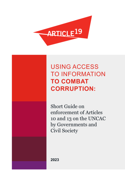 "Based on Articles 10 and 13 of the United Nations Convention against Corruption (UNCAC) as an entry-point and building on recent developments in international human rights and multi-stakeholder initiatives focusing on anticorruption, transparency and openness, this Guide documents the importance of access to information (ATI) at the transnational and national levels to support efforts preventing corruption, showcasing both existing and emerging practices. It presents examples of how proactive disclosure and reactive disclosure of information support anticorruption efforts in terms of prevention and investigation. ATI is at the heart of many international and sector-based initiatives that build on citizens’ participation to improve accountability and increase transparency in public life. The Guide is an abbreviated version of ARTICLE 19’s detailed guide, published in 2022. It presents to all anti-corruption practitioners’ examples and initiatives initiated by States Parties to the UNCAC, international organizations, civil society organizations, and the private sector to promote ATI. It also exhibits how their combined or individual efforts contribute to fighting corruption and increasing transparency." (Introduction)