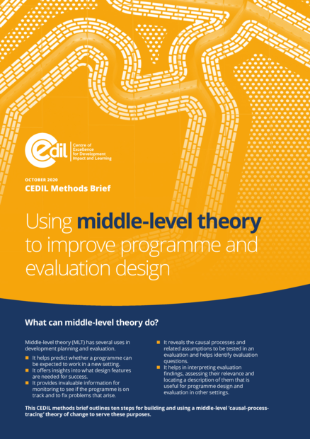 "Middle-level theory (MLT) has several uses in development planning and evaluation. It helps predict whether a programme can be expected to work in a new setting. It offers insights into what design features are needed for success. IIt provides invaluable information for monitoring to see if the programme is on track and to fix problems that arise. It reveals the causal processes and related assumptions to be tested in an evaluation and helps identify evaluation questions. It helps in interpreting evaluation findings, assessing their relevance and locating a description of them that is useful for programme design and evaluation in other settings. This CEDIL methods brief outlines ten steps for building and using a middle-level ‘causal-processtracing’ theory of change to serve these purposes." (Page 1)