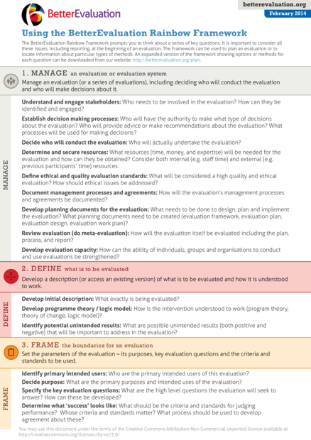 "The BetterEvaluation Rainbow Framework prompts you to think about a series of key questions. It is important to consider all these issues, including reporting, at the beginning of an evaluation. The Framework can be used to plan an evaluation or to locate information about particular types of methods. An expanded version of the framework showing options or methods for each question can be downloaded from our website: http://betterevaluation.org/plan." (Introduction)