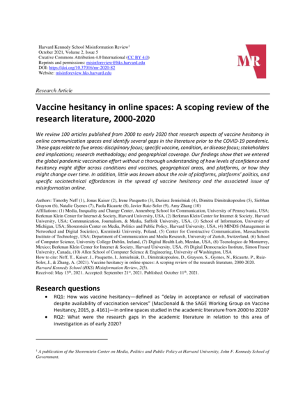 "We review 100 articles published from 2000 to early 2020 that research aspects of vaccine hesitancy in online communication spaces and identify several gaps in the literature prior to the COVID-19 pandemic. These gaps relate to five areas: disciplinary focus; specific vaccine, condition, or disease focus; stakeholders and implications; research methodology; and geographical coverage. Our findings show that we entered the global pandemic vaccination effort without a thorough understanding of how levels of confidence and hesitancy might differ across conditions and vaccines, geographical areas, and platforms, or how they might change over time. In addition, little was known about the role of platforms, platforms’ politics, and specific sociotechnical affordances in the spread of vaccine hesitancy and the associated issue of misinformation online." (Abstract)