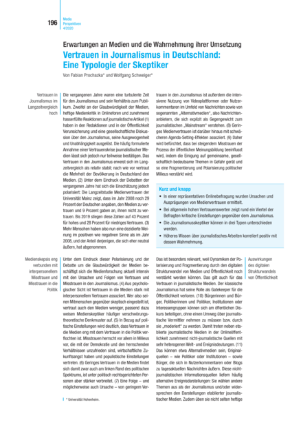 "In einer repräsentativen Onlinebefragung wurden Ursachen und Ausprägungen von Medienvertrauen ermittelt. Bei allgemein hohen Vertrauenswerten zeigt rund ein Viertel der Befragten kritische Einstellungen gegenüber dem Journalismus. Die Journalismusskeptiker können in drei Typen unterschieden werden. Höheres Wissen über journalistisches Arbeiten korreliert positiv mit dessen Wahrnehmung." (Kurz und knapp, Seite 196)