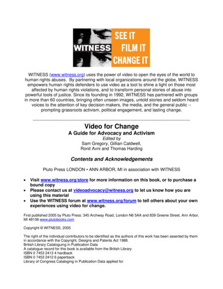 "This book is an invitation—an invitation to discover the potential of a simple video camera and the power it holds to spark social change. Every day, all around the world, activists draw upon video in creative, strategic ways and use the results to ensure that silent voices are heard and important reforms are made. In this book we will show you how they do this, and how you can do it too [...] These chapters will walk you through the process of “video advocacy.” By this phrase we mean the use of video as an essential tool in social justice activism—one that can be deployed as strategically and effectively as more traditional forms of “advocacy” referring to the range of ways to exert pressure for a defi ned goal of change, including persuasion, relationship-building, lobbying, organizing, and mobilizing. We will draw on the inspiring real-life experiences of social justice video advocates worldwide—groups that have worked with the human rights organization WITNESS where I work, and a range of other wellknown and lesser-known fi gures in the activist universe. Throughout you’ll fi nd an emphasis on the emotional and empathetic aspect of video, on its humanizing ability to communicate across boundaries. We also stress the need for collaboration within organizations and among outside allies to more successfully facilitate the production and use of video." (Introduction, page xii-xiii)