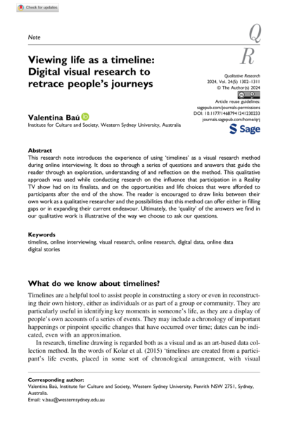 "This research note introduces the experience of using ‘timelines’ as a visual research method during online interviewing. It does so through a series of questions and answers that guide the reader through an exploration, understanding of and reflection on the method. This qualitative approach was used while conducting research on the influence that participation in a Reality TV show had on its finalists, and on the opportunities and life choices that were afforded to participants after the end of the show. The reader is encouraged to draw links between their own work as a qualitative researcher and the possibilities that this method can offer either in filling gaps or in expanding their current endeavour. Ultimately, the ‘quality’ of the answers we find in our qualitative work is illustrative of the way we choose to ask our questions." (Abstract)