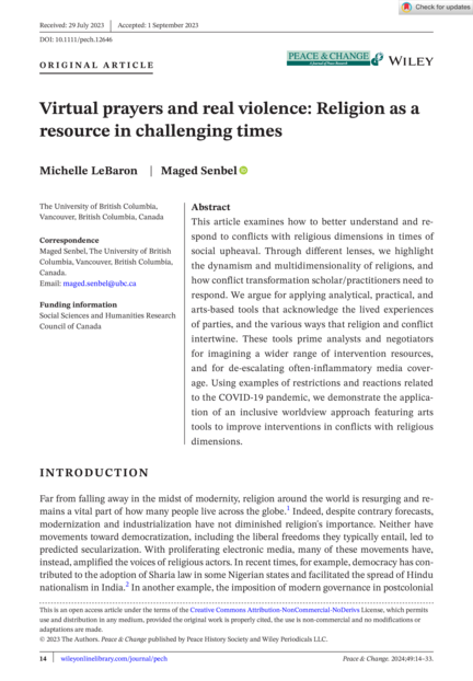 "This article examines how to better understand and respond to conflicts with religious dimensions in times of social upheaval. Through different lenses, we highlight the dynamism and multidimensionality of religions, and how conflict transformation scholar/practitioners need to respond. We argue for applying analytical, practical, and arts-based tools that acknowledge the lived experiences of parties, and the various ways that religion and conflict intertwine. These tools prime analysts and negotiators for imagining a wider range of intervention resources, and for de-escalating often-inflammatory media coverage. Using examples of restrictions and reactions related to the COVID-19 pandemic, we demonstrate the application of an inclusive worldview approach featuring arts tools to improve interventions in conflicts with religious dimensions." (Abstract)