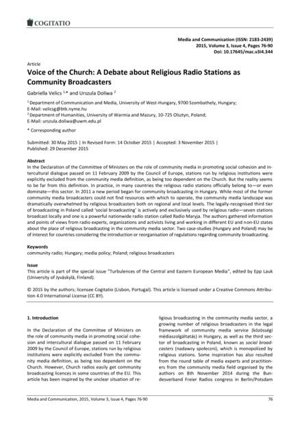 "In the Declaration of the Committee of Ministers on the role of community media in promoting social cohesion and intercultural dialogue passed on 11 February 2009 by the Council of Europe, stations run by religious institutions were explicitly excluded from the community media definition, as being too dependent on the Church. But the reality seems to be far from this definition. In practice, in many countries the religious radio stations officially belong to—or even dominate—this sector. In 2011 a new period began for community broadcasting in Hungary. While most of the former community media broadcasters could not find resources with which to operate, the community media landscape was dramatically overwhelmed by religious broadcasters both on regional and local levels. The legally-recognised third tier of broadcasting in Poland called ‘social broadcasting’ is actively and exclusively used by religious radio—seven stations broadcast locally and one is a powerful nationwide radio station called Radio Maryja. The authors gathered information and points of views from radio experts, organizations and activists living and working in different EU and non-EU states about the place of religious broadcasting in the community media sector. Two case-studies (Hungary and Poland) may be of interest for countries considering the introduction or reorganisation of regulations regarding community broadcasting." (Abstract)