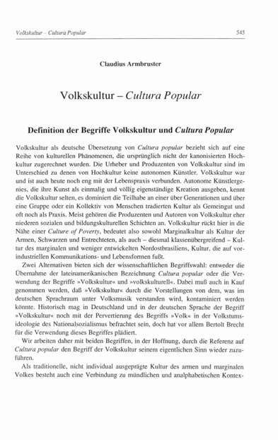 Definition der Begriffe Volkskultur und Cultura Popular -- Volkserzählungen und Volksliteratur zwischen Mündlichkeit und Schriftlichkeit [literatura de cordel] -- Volksspiele und Tanzdramen [Bumba-meu-boi, Congos, Maracatú] --Karneval -- Capoeira -- Fußball