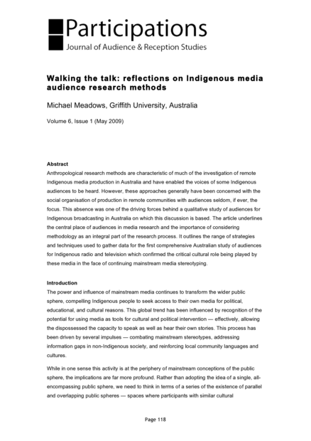 "Anthropological research methods are characteristic of much of the investigation of remote Indigenous media production in Australia and have enabled the voices of some Indigenous audiences to be heard. However, these approaches generally have been concerned with the social organisation of production in remote communities with audiences seldom, if ever, the focus. This absence was one of the driving forces behind a qualitative study of audiences for Indigenous broadcasting in Australia on which this discussion is based. The article underlines the central place of audiences in media research and the importance of considering methodology as an integral part of the research process. It outlines the range of strategies and techniques used to gather data for the first comprehensive Australian study of audiences for Indigenous radio and television which confirmed the critical cultural role being played by these media in the face of continuing mainstream media stereotyping." (Abstract)