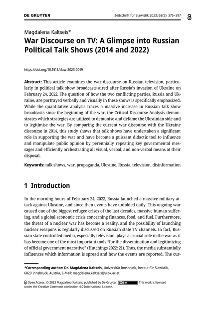 "This article examines the war discourse on Russian television, particularly in political talk show broadcasts aired after Russia’s invasion of Ukraine on February 24, 2022. The question of how the two conflicting parties, Russia and Ukraine, are portrayed verbally and visually in these shows is specifically emphasized. While the quantitative analysis traces a massive increase in Russian talk show broadcasts since the beginning of the war, the Critical Discourse Analysis demonstrates which strategies are utilized to demonise and defame the Ukrainian side and to legitimise the war. By comparing the current war discourse with the Ukraine discourse in 2014, this study shows that talk shows have undertaken a significant role in supporting the war and have become a puissant didactic tool to influence and manipulate public opinion by perennially repeating key governmental messages and efficiently orchestrating all visual, verbal, and non-verbal means at their disposal." (Abstract)