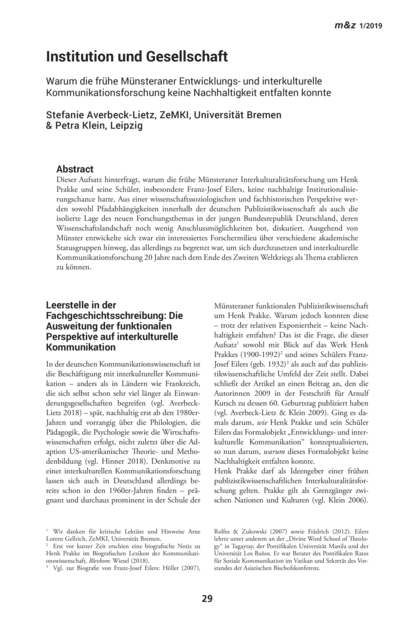 "Dieser Aufsatz hinterfragt, warum die frühe Münsteraner Interkulturalitätsforschung um Henk Prakke und seine Schüler, insbesondere Franz-Josef Eilers, keine nachhaltige Institutionalisierungschance hatte. Aus einer wissenschaftssoziologischen und fachhistorischen Perspektive werden sowohl Pfadabhängigkeiten innerhalb der deutschen Publizistikwissenschaft als auch die isolierte Lage des neuen Forschungsthemas in der jungen Bundesrepublik Deutschland, deren Wissenschaftslandschaft noch wenig Anschlussmöglichkeiten bot, diskutiert. Ausgehend von Münster entwickelte sich zwar ein interessiertes Forschermilieu über verschiedene akademische Statusgruppen hinweg, das allerdings zu begrenzt war, um sich durchzusetzen und interkulturelle Kommunikationsforschung 20 Jahre nach dem Ende des Zweiten Weltkriegs als Thema etablieren zu können." (Abstract)