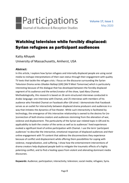 "In this article, I explore how Syrian refugees and internally displaced people are using social media to reshape interpretations of their own status through their engagement with quality TV texts that tackle the refugee crisis. I focus on the discourse surrounding the Syrian Television Drama series Ghadan Naltaqi (GN) [We'll Meet Tomorrow] which is particularly interesting because of the dialogue that has developed between the forcibly displaced segment of its audience and the writer/creator of the show, Iyad Abou Chamat. Methodologically, this research is based on 26 semi-structured interviews conducted in Arabic language: one interview with Chamat, and 25 interviews with members of his audience who friended Chamat on Facebook after GN aired. I demonstrate that Facebook serves as an outlet for interactivity between displaced drama producers and audiences in a way that imitates the dynamics of live theater. While such interactivity is facilitated by technology, the emergence of this interactive relationship is owned to the desires for (re-)connection of both drama creators and audiences stemming from the alienation of war, violence and displacement." (Abstract)
