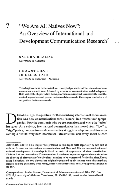 "This chapter reviews the historical and conceptual parameters of the international communication research area, followed by a focus on communication and development. Both parts of the chapter define the scope of the areas discussed, summarize the main theoretical approaches, and present major trends in research. The chapter concludes with suggestions for future research." (Summary)