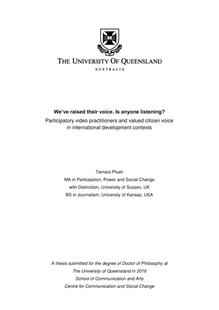 "This thesis offers a study on the nuanced understandings of and the interplay between participatory video (PV), citizen voice and international development. The study investigates contemporary PV practitioners’ conceptualisations of the phenomenon of using PV to raise citizen voice in international development contexts. The study participants were 25 global PV practitioners who had experience on more than 650 PV projects. Of those projects, approximately 250 specifically aimed to raise the voice of excluded groups in international development contexts. Through investigating the PV practitioners’ perceptions of the phenomenon, the study identified three distinct epistemologies relevant to PV practice and raising citizen voice. The study called these the amplified, engaged and equitable voice pathways. Making the three categories explicit is of critical value to the PV field. They provide a language and theoretical grounding for why certain PV approaches may be more effective than others for social and/or political change. Of the three pathways, the research ultimately deemed equitable voice as the most viable for citizen voice to be both authentically representative and respectively valued in decision-making spaces. Accordingly, the study drew from scholarship and the characteristics within the equitable voice pathway to develop a conceptual framework for raising valued citizen voice with PV. The framework offers five key principles; named as personal recognition, collective representation, social and political recognition, responsive listening and empathic relationships. While having a framework is valuable for PV practice, the study also recognised that a conceptual framework in itself is often insufficient. Its viability requires an enabling environment for meaningful application. Thus, the research also identified six institutional views of PV practice in international development contexts with potential to diminish voice. It named them as the output-focused, voice opportunity, apolitical, agenda-led, harmless and uncomplicated views. These were views the PV practitioners in the study described as constraining their ideals in practice. The views ranged from institutions prioritising PV film outputs over political dialogue to institutions setting agendas with potential to suppress authentic citizen voice. The study interrogated the identified institutional views to discover their differing possibilities for legitimising or limiting citizen voice. The thesis concludes by encouraging three areas of consideration for participatory video to enhance citizen voice in democratic decision-making processes. First, it proposes deliberate attention on strengthening voice representation and voice receptivity in PV activities to reduce social and political inequity. Second, it promotes recognition of how political and institutional environments influence PV’s ability to raise citizen voice sufficiently. Third, it suggests greater reflection on how PV practitioners’ conceptualisations of voice affect citizen voice outcomes; and how practitioners might use their own agency to ensure meaningful change. Such forethought and action expands possibilities for PV practice to support citizen voice in being heard, valued and influential." (Abstract)