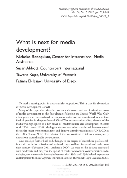 "What comes next for media development? Though the contributors to this volume [i.e., the special issue focusing on international media development] provide answers from diverse perspectives, they each touch upon questions of agency and localization. The contributors investigate major issues with a bearing on media development literature in a bid to explore some conceptual frameworks and lay down a path for an action-oriented practice." (Page 137)