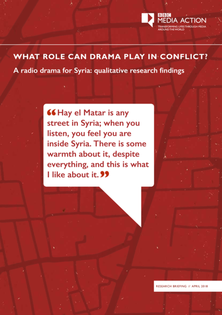 "Against the backdrop of the war in Syria BBC Media Action produced and broadcast 150 episodes of the radio drama Hay el Matar (Airport District) between 2015 and 2017. Funded by the European Commission as part of a broader project aiming to help build an open and inclusive society in Syria, the drama and an accompanying weekly discussion programme was available online and on BBC Arabic. Set in a fictional Damascus suburb, Hay el Matar followed the daily lives of residents and featured love affairs, family feuds and tragedies. Each episode was scripted by a team of Syrian writers and touched on a different issue - from violence, radicalisation and migration, to economic insecurity and forced marriage. To understand how listeners engaged with Hay El Matar, BBC Media Action commissioned and trained local non-governmental organisations (NGOs) to conduct focus group discussions with listeners in Syria and Lebanon. We found that the drama prompted listeners to think about topical issues, challenges stereotypes and have a view of the Syrian conflict that extended beyond their own personal experience. It also challenged their assumptions and prompted them to talk about and reflect on other people’s multi-faceted experiences of the conflict." (https://www.bbc.co.uk/mediaaction)