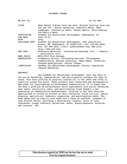 "The Academy for Educational Development (AED) has been in the social marketing, communication, and participation business for some 40 years. This book profiles 82 projects carried out in the 1960s and 1970s in countries around the world. These projects were researched and documented by AED under its Clearinghouse on Development Communication. It is hoped that the book's profiles of extraordinary early experiments with social marketing, mass media, interactive radio, and participation might benefit a new generation of communication professionals. Profiles in the book describe applications to fields as diverse as basic education, child survival, family planning, agriculture, community organizing, and participatory media. The book opens with an easy-to-read index and a table of contents. Synopses of each project follow, providing a description, results, facts of note, references, target audience, objectives, media, donors/sponsors, duration, and contacts." (www.eric.ed.gov)