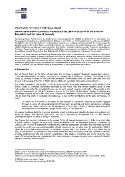 "This article takes UNESCO’s Academic Research Agenda on Safety of Journalists as its point of departure. We present an overview of contributions to a selection of research conferences and academic publications focusing on safety of journalists and categorize them according to the research agenda. The overall aim of the contributions is to discuss research on ideas andpractices that create unsafe conditions, as well as possible strategies and solutions from practical, theoretical, national orinternational perspectives. Through this exercise, we find where the focus areas are and what is lacking in current research on safety of journalists, and the discussion serves as an introduction to the chapters of this special issue." (Abstract)