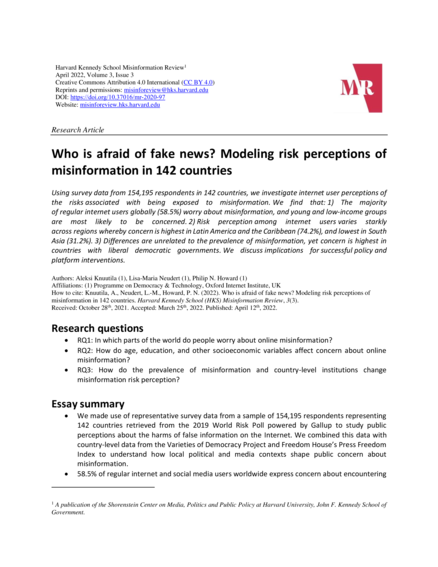 "Using survey data from 154,195 respondents in 142 countries, we investigate internet user perceptions of the risks associated with being exposed to misinformation. We find that: 1) The majority of regular internet users globally (58.5%) worry about misinformation, and young and low-income groups are most likely to be concerned. 2) Risk perception among internet users varies starkly across regions whereby concern is highest in Latin America and the Caribbean (74.2%), and lowest in South Asia (31.2%). 3) Differences are unrelated to the prevalence of misinformation, yet concern is highest in countries with liberal democratic governments. We discuss implications for successful policy and platform interventions." (Abstract)