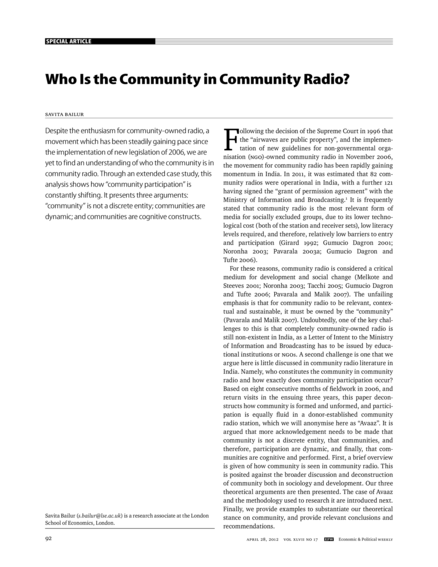 "Despite the enthusiasm for community-owned radio, a movement which has been steadily gaining pace since the implementation of new legislation of 2006, we are yet to find an understanding of who the community is in community radio. Through an extended case study, this analysis shows how “community participation” is constantly shifting. It presents three arguments: “community” is not a discrete entity; communities are dynamic; and communities are cognitive constructs." (Introduction)