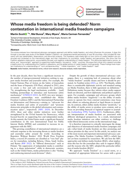"This article analyses how international advocacy campaigns approach and define media freedom, and what influences this process. It does this through a two-year case study of the Media Freedom Coalition—an intergovernmental partnership of over 50 countries—that included 55 interviews with key stakeholders, observations, and document analysis. This revelatory case sheds light on how norms of media freedom are constructed and contested on the international stage, and their implications for journalists, media freedom and geo-politics. We show that the Coalition adopted a state-centric, accountability-focused, and negative understanding of media freedom. This discourse legitimized a narrow, reactive, and “resource-light” approach to supporting media freedom, focused on “other” countries. We argue that critical norm research provides a helpful prism for understanding this Coalition’s operations, and the global politics of media freedom more generally. These findings have important implications for understandings of “norm entrepreneurship,” “media imperialism,” and “media freedom” itself." (Abstract)