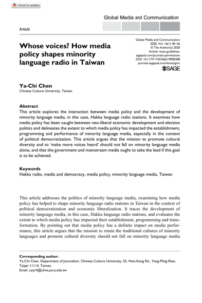 "This article explores the interaction between media policy and the development of minority language media, in this case, Hakka language radio stations. It examines how media policy has been caught between neo-liberal economic development and election politics and delineates the extent to which media policy has impacted the establishment, programming and performance of minority language media, especially in the context of political democratization. This article argues that the mission to promote cultural diversity and to ‘make more voices heard’ should not fall on minority language media alone, and that the government and mainstream media ought to take the lead if this goal is to be achieved." (Abstract)