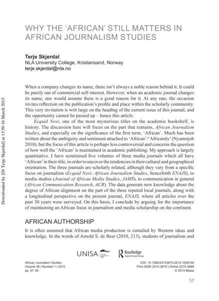 "I have scrutinised five volumes of three media journals which all have ‘African’ in their title, in order to uncover the tendencies in their cultural and geographical orientation. The three journals are scholarly related, although they vary from a specific focus on journalism (Ecquid Novi: African Journalism Studies, henceforth ENAJS), to media studies (Journal of African Media Studies, JAMS), to communication in general (African Communication Research, ACR). The data generate new knowledge about the degree of African alignment on the part of the three reputed local journals, along with a longitudinal perspective on the present journal, ENAJS, where all articles over the past 30 years were surveyed. On this basis, I conclude by arguing for the importance of maintaining an African focus in journalism and media scholarship on the continent." (Page 57)
