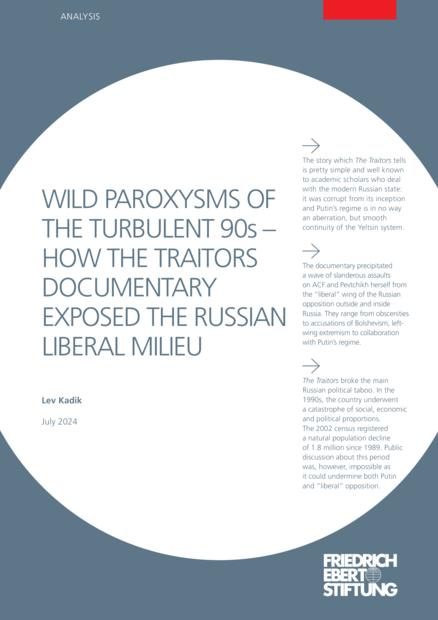 "The story which The Traitors tells is pretty simple and well known to academic scholars who deal with the modern Russian state: it was corrupt from its inception and Putin’s regime is in no way an aberration, but smooth continuity of the Yeltsin system. The documentary precipitated a wave of slanderous assaults on ACF and Pevtchikh herself from the “liberal” wing of the Russian opposition outside and inside Russia. They range from obscenities to accusations of Bolshevism, left-wing extremism to collaboration with Putin’s regime. The Traitors broke the main Russian political taboo. In the 1990s, the country underwent a catastrophe of social, economic and political proportions. The 2002 census registered a natural population decline of 1.8 million since 1989. Public discussion about this period was, however, impossible as it could undermine both Putin and “liberal” opposition." (Page 1)
