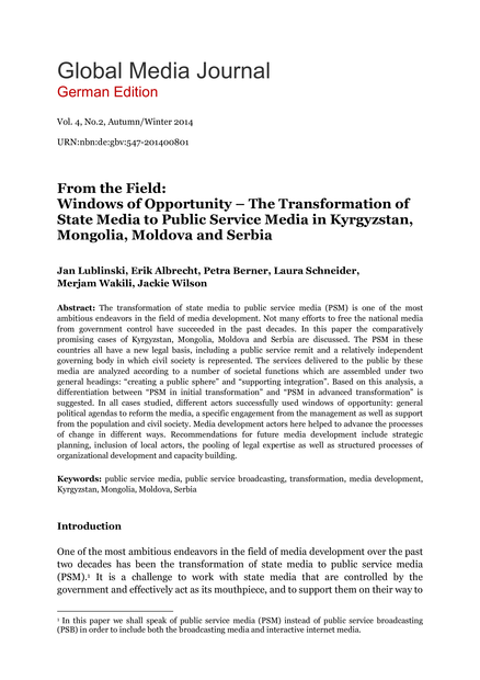 "The transformation of state media to public service media (PSM) is one of the most ambitious endeavors in the field of media development. Not many efforts to free the national media from government control have succeeded in the past decades. In this paper the comparatively promising cases of Kyrgyzstan, Mongolia, Moldova and Serbia are discussed. The PSM in these countries all have a new legal basis, including a public service remit and a relatively independent governing body in which civil society is represented. The services delivered to the public by these media are analyzed according to a number of societal functions which are assembled under two general headings: “creating a public sphere” and “supporting integration”. Based on this analysis, a differentiation between “PSM in initial transformation” and “PSM in advanced transformation” is suggested. In all cases studied, different actors successfully used windows of opportunity: general political agendas to reform the media, a specific engagement from the management as well as support from the population and civil society. Media development actors here helped to advance the processes of change in different ways. Recommendations for future media development include strategic planning, inclusion of local actors, the pooling of legal expertise as well as structured processes of organizational development and capacity building." (Abstract)
