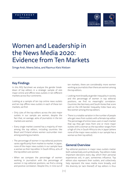 "In this RISJ factsheet we analyse the gender break-down of top editors in a strategic sample of 200 major online and offline news outlets in ten different markets across four continents.Looking at a sample of ten top online news outlets and ten top offline news outlets in each of these ten markets, we find: Only 23% of the top editors across the 200 major outlets in our sample are women, despite the fact that, on average, 40% of journalists in the ten markets are women; Every single market covered has a majority of men among the top editors, including countries like Brazil and Finland where women outnumber men among working journalists; The percentage of women in top editorial positions varies significantly from market to market. In Japan, none of the major news outlets in our sample have a woman as their top editor. In South Africa, 47% of the top editors are women; When we compare the percentage of women working in journalism with the percentage of women in top editorial positions, we find a strong and positive correlation. Despite this, in nine out of ten markets, there are considerably more women working as journalists than there are women among the top editors; Looking more broadly at gender inequality in society and the percentage of women in top editorial positions, we find no meaningful correlation. Countries like Germany and South Korea that score well on the UN Gender Inequality Index have very few women among the top editors." (Key findings)