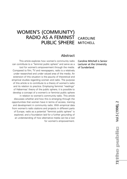 "This article explores how women's community radio can contribute to a feminist public sphere and serve as a tool for women's empowerment through the media. Compared to film, TV and newspapers, radio is a relatively under researched and under valued area of the media. An extension of this situation is the paucity of theoretical and empirical studies regarding women and radio. The purpose of this article is to contribute to a theory of women's radio and its relation to practice. Employing feminist readings of Habermas' theory of the public sphere, it is possible to develop a concept of a women's or feminist public sphere in relation to women's community radio. This article discusses whether and how this is emerging through the opportunities that women have in terms of access, training and development in community radio. With empirical data from women's radio stations and projects in different parts of Europe, radio as a potential feminist public sphere is explored, and a foundation laid for a further grounding of an understanding of how alternative media can be a tool for women's empowerment." (Abstract)