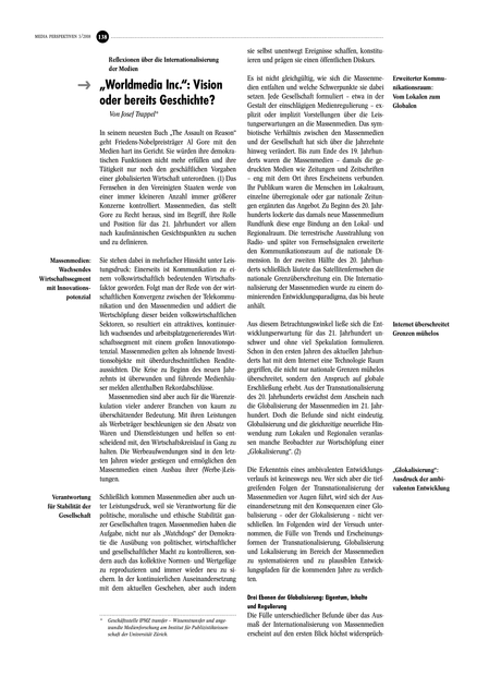 "Im Fazit lassen sich zwei Befunde festhalten: Erstens erweist sich die Medienkonzentration weiterhin als zentrale Bewegungsenergie für die Internationalisierung der Massenmedien. Sie wird nicht nur im klassischen Medienbereich von Fernsehen, Radio und Printmedien vorangetrieben, sondern erfährt eine Parallele auch in den neuen internetbasierten Netzwerken – jedenfalls in deren gewinnorientierten Sektoren. Die grenzüberschreitende Medienkonzentration findet ihre Grenzen in aller Regel erst dann, wenn sie im Destinationsland von Investitionen erneut gegen nationale Wettbewerbsregeln verstößt. Gleichzeitig führt die internationale Medienkonzentration zur Betonung der Kapitallogik in den Destinationsländern und zu einer Lockerung jener Rechenschaft, zu der Medienunternehmen der Gesellschaft und dem politisch-demokratischen Gefüge gegenüber verpflichtet sind, in dem sie tätig sind. Das Überschreiten von ethischen und journalistischen Grenzen in den Medien der Destinationsländer, die in den Medien der Herkunftsländer eines Konzerns verbindlich gelten, illustriert diesen Befund. Zweitens erfährt die regionale und nationale Sprachraumebene, die weiterhin das relevante Spielfeld für Massenmedien darstellt, durch die Internationalisierung einen Verlust an kommunikativer Autonomie. Müssen Entscheidungen nachvollzogen werden, die von Konzernzentralen in anderen Ländern und aus einem anderen politisch-demokratischen Normenkontext getroffen werden, so führt dies zu einem Verlust an Entscheidungsautonomie und zu entsprechenden Konsequenzen für die politische und gesellschaftliche Kommunikation." (Fazit, Seite 147)