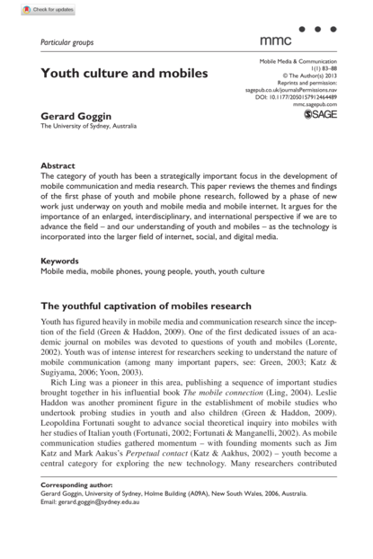"The category of youth has been a strategically important focus in the development of mobile communication and media research. This paper reviews the themes and findings of the first phase of youth and mobile phone research, followed by a phase of new work just underway on youth and mobile media and mobile internet. It argues for the importance of an enlarged, interdisciplinary, and international perspective if we are to advance the field – and our understanding of youth and mobiles – as the technology is incorporated into the larger field of internet, social, and digital media." (Abstract)