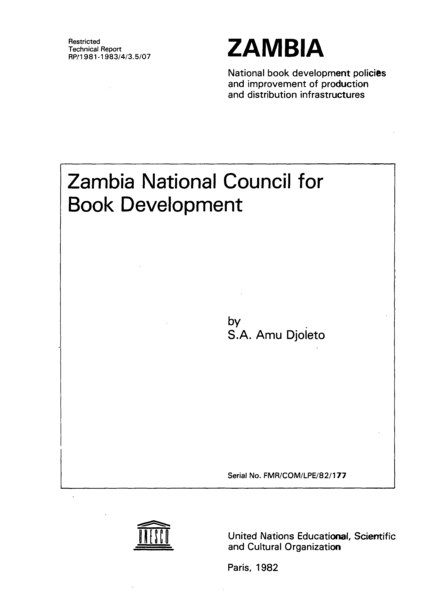 "A UNESCO mission report to assist the Government of Zambia in the establishment of a National Council for Book Development; to advise the government on the objectives and functioning of such a Council, to assist in the drafting of the Council's constitution and advise on its staff and budget; and to assist in the preparation of a detailed work plan of the Council as well as its administrative and management plan." (Hans M. Zell, Publishing, Books & Reading in Sub-Saharan Africa, 3d ed. 2008, nr. 1184)