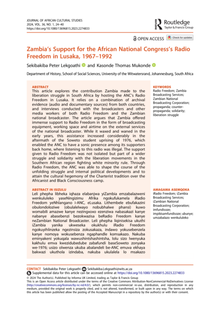 "This article explores the contribution Zambia made to the liberation struggle in South Africa by hosting the ANC’s Radio Freedom in Lusaka. It relies on a combination of archival evidence (audio and documentary sources) from both countries, and interviews conducted with the broadcasters and other media workers of both Radio Freedom and the Zambian national broadcaster. The article argues that Zambia offered immense support to Radio Freedom in the form of broadcasting equipment, working space and airtime on the external services of the national broadcaster. While it waxed and waned in the early years, this assistance increased considerably in the aftermath of the Soweto student uprising of 1976, which enabled the ANC to have a sonic presence among its supporters back home, where listening to this radio was illegal. The support given to Radio Freedom was not isolated but part of a wider struggle and solidarity with the liberation movements in the Southern African region fighting white minority rule. Through Radio Freedom, the ANC was able to shape the course of the unfolding struggle and internal political developments and to attain the cultural hegemony of the Charterist tradition over the Africanist and Black Consciousness camp." (Abstract)