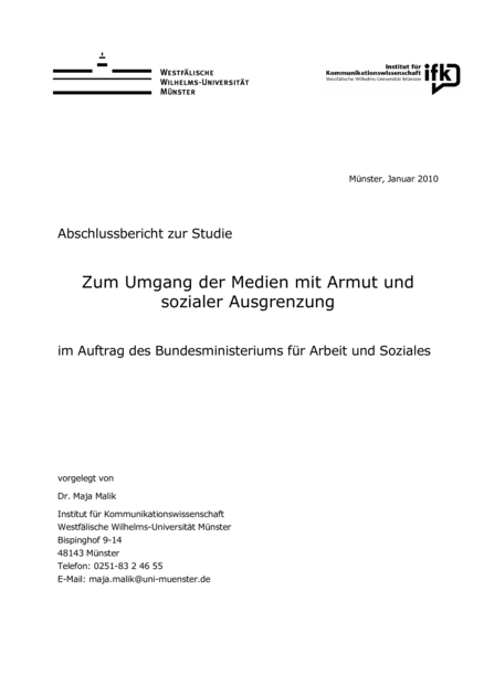 "In Vorbereitung auf das Europäische Jahr gegen Armut und soziale Ausgrenzung (EJ 2010) gab das Bundesministerium für Arbeit und Soziales (BMAS) im Herbst 2009 das Forschungsvorhaben „zum Umgang der Medien mit Armut und sozialer Ausgrenzung“ in Auftrag. Der Abschlussbericht zu diesem Forschungsprojekt wird hier vorgelegt. Auf der Basis einer umfangreichen Inhaltsanalyse von 17 ausgewählten journalistischen Nachrichtenmedien und Leitfaden gestützten Interviews mit 13 Journalistinnen und Journalisten dieser Medien wurden die formalen und inhaltlichen Charakteristika der Berichterstattung über Armut und Ausgrenzung erfasst sowie Erklärungsmuster über das Zustandekommen dieser Berichterstattung in den Redaktionen erhoben. Der vorliegende Bericht hat damit die Funktion einer Pilotstudie: Auf der Basis einer Auswahl von reichweitenstarken, überregionalen Medien und mit der Konzentration auf zwei Untersuchungswochen werden die grundlegenden Mechanismen der Berichterstattung über Armut umfassend nachvollzogen. Dabei werden Medienbeiträge dann als Armutsberichterstattung verstand en, wenn sie finanzielle und materielle Unterversorgung thematisieren oder einen Mangel an gesellschaftlichen Partizipationsmöglichkeiten beschreiben." (Kurzfassung, Seite 6)