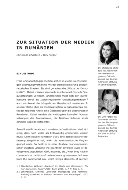 "Von einer konsolidierten Medienlandschaft ist Rumänien noch entfernt. Gewiss, die Pressefreiheit hat sich nach 2004 verbessert und die Verfassung spricht von Gewissens-, Meinungs- und Religionsfreiheit, verbietet Zensur und sichert das Recht auf Information. Doch hört „freie Meinungsäußerung” da auf, wo „die Ehre” anderer und die „nationale Sicherheit” betroffen sind. Die Medienlandschaft des Landes selbst ist vielfältig: Lokal und regional gibt es ein breites Angebot an Tages- und Wochenzeitungen. Im TV-Bereich sind die Privaten im Kommen. Der öffentlich-rechtliche Hörfunk hat zahlreiche Kanäle sowie internationale, lokale und regionale Sender. Noch kaum verbreitet ist das Internet. Bei den Besitzverhältnissen sind Korruption und „oligopolistische” Marktstrukturen kennzeichnend. Die Werbung für Staatsfirmen und die Subventionierung vieler Medien schaffen wirtschaftlich-politischen Druck, setzen journalistischer Unabhängigkeit Grenzen. Soll Medienfreiheit in Rumänien Wurzeln finden, wäre eine Reform der institutionellen Voraussetzungen ebenso vonnöten wie eine Rückbesinnung auf ethische Standards." (Seite 44)
