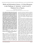 as infected over 167 thousand people and killed 2,119 people between February 27th, the day the first case was recorded and 26th June 2021. Unfortunately, as the virus continues to spread worldwide, there is also a rapid increase in the rate of infodemic - information overload majority of which are fake, disinformation and misinformation - about the virus, its transmission and cure. Thus, this paper interrogates the present reality of the infodemic in Nigeria, especially in the present COVID-19 pandemic and the vision of media and information literacy. The problem concerned the extent to which infodemic could precariously engineer crisis, disgust, fear, hostility and panic which might degenerate to conflict, insecurity, stigmatisation and eventual death. Combining textual analysis with receptor oriented, the article critically examined the social media platform posts and activities in this domain. Major findings apart from revealing that the free and unlimited access to information on social media platforms have been the active driver of the current experience, also showed that the inability of people to discern the veracity and authenticity of information within the context of the COVID-19 pandemic have made many vulnerable. Thus, the present article concluded that media and information literacy is a necessity in fighting the challenge of infodemic in Nigeria and promoting healthy information in media and technological environments. Therefore, among others, the introduction of media and information literacy to both literate and illiterate sectors of society is recommended." (Abstract)