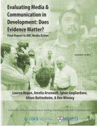 ch in general and BBC Media Action research in particular, remains uncertain. To shed greater light on this question, in October 2012, the Center for Global Communication Studies at the Annenberg School for Communication, University of Pennsylvania, conducted a quantitative survey followed by in-depth, structured interviews with 57 development stakeholders from four areas of development: governance, humanitarian response, health, and resilience. These research methods were used to investigate: (1) prevailing perceptions about and uses of media among assorted development stakeholders, (2) the extent to which these stakeholders are familiar with and utilize existing research concerning media development and media for development, (3) if and how funders are using this research to decide funding and policy making priorities, and (4) the specific impact of research and evidence initiated by BBC Media Action." (Executive summary)