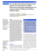 formation directly to subscribers’ phones. However, little is known about the reach of Kilkari among different subgroups in the population, or the differentiated benefits of the programme among these subgroups. In this analysis, we assess differentials in eligibility, enrolment, reach, exposure and impact across well-known proxies of socioeconomic position—that is, education, caste and wealth. Data are drawn from a randomised controlled trial (RCT) in Madhya Pradesh, India, including call data records from Kilkari subscribers in the RCT intervention arm, and the National Family Health Survey-4, 2015. The analysis identifies that disparities in household phone ownership and women’s access to phones create inequities in the population eligible to receive Kilkari, and that among enrolled Kilkari subscribers, marginalised caste groups and those without education are under-represented. An analysis of who is left behind by such interventions and how to reach those groups through alternative communication channels and platforms should be undertaken at the intervention design phase to set reasonable expectations of impact. Results suggest that exposure to Kilkari has improved levels of some health behaviours across marginalised groups but has not completely closed pre-existing gaps in indicators such as wealth and education." (Abstract)