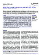 534 online participants in India using Amazon Mechanical Turk (MTurk) from December 2021 through January 2022. We assessed participants' perception of three messaging appeals of vaccination -COVID-19 disease health outcomes, social norms related to vaccination, and economic impact of COVID-19 - from two messengers, healthcare providers (HCP) and peers. Using a multivariable multinomial logistic regression, we examined participants' ad preference and vaccine hesitancy. Participants expressed a high level of approval for all of the ads, with >80% positive responses for all questions across ads. Overall ads delivered by health care workers were preferred by a majority of participants in our study (n = 381, 71.4%). Ad preference ranged from 3.6% (n=19) social norm/peer ad to 32.4% (n = 173) health outcome/ HCP ad and half of participants preferred the health outcome ad (n = 279, 52.3%). Additionally, vaccine hesitancy was not related to preference (p = .513): HCP vs. peer ads (p = .522); message type (p =.284). The results suggest that all three appeals tested were generally acceptable, as well as the two messenger types, although preference was for the health care provider messenger and health outcome appeal. Individuals are motivated and influenced by a multitude of factors, requiring vaccine messaging that is persuasive, salient, and induces contextually relevant action." (Abstract)