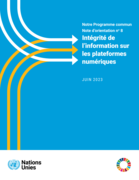 tous et toutes, tout en défendant vigoureusement le droit à la liberté d’opinion et d’expression ainsi que le droit d’accès à l’information. Le code de conduite portant sur l’intégrité de l’information diffusée sur les plateformes numériques est en cours d’élaboration dans le cadre des préparatifs du Sommet de l’avenir. J’espère qu’il servira de guide dans la formulation de mesures de renforcement de l’intégrité de l’information. Les plateformes numériques sont des outils essentiels qui ont transformé les interactions sociales, culturelles et politiques partout dans le monde, en mettant en relation des citoyens préoccupés par des questions importantes. Grâce à elles, les Nations Unies informent le public et dialoguent directement avec les personnes qui oeuvrent en faveur de la paix, de la dignité et de l’égalité sur une planète saine. Ces plateformes ont donné de l’espoir aux peuples pendant les périodes de crise et de lutte, elles ont amplifié des voix qui n’étaient pas entendues auparavant et fait naître des mouvements mondiaux." (Objet de la présente note, page 2)