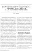 nica y en la creación de sus organizaciones políticas representativas; el tipo de vinculación de los pueblos Ashaninka y Aguaruna, el estado y la televisión sobre todo en la redefinición del concepto de identidad nacional en el contexto de diferentes conflictos armados, y finalmente, se presenta el uso de Internet por el pueblo Ashaninka. El objetivo principal del articulo es mostrar como el empleo de los medios de comunicación permite a las comunidades indígenas hacerse más visibles y actuar políticamente en distintos espacios públicos." (Resumen)