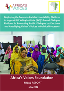 "Africa's Voices Foundation in partnership with Rift Valley institute (RVI)'s Somali Dialogue Platform implemented a 3-month project between February 8th - May 7th 2022. The project promoted public dialogue around elections so as to understand citizens' perspectives on Somalia's national elections.