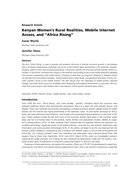 hether this economic growth benefits Africa’s rural areas. In this article, we extend this critique to the optimism surrounding access to the mobile Internet by detailing rural women’s experiences with mobile devices. Drawing on data from our long-term fieldwork in Western Kenya, we describe how secondhand handsets, misinformation about social media, and gendered allocations of time constrain women’s access to the mobile Internet. We then discuss how the materiality of mobile phones, seasonal changes, and other factors must be considered when developing technological interventions in rural areas. We conclude that rural women’s lived realities merit more attention within growth narratives about Africa." (Abstract)
