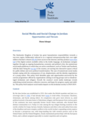 able online in the Arabic language. As Jordanians navigate together through an ongoing humanitarian, economic and political crisis, the mainstream social media platforms to which they are active contributors, such as Twitter and Facebook, with the latter being the top app in the country, are turning into interactive spaces critical for public debate and socio-political transformation. The uses of mainstream social media include coping with the consequences of war, displacement, and the identity negotiations of a young nation. This policy brief identifies gaps and opportunities uncovered by the current programmes offered by organisations aiming at serving groups such as disadvantaged Jordanians and refugees. Overall, the country’s social media landscape reveals underlying societal tensions, collective concerns, and hopes for progress, equity and stability. This policy brief analyses social media impacts on the Jordanian society in 2018-2019." (Overview)