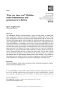 ch privileges the relationship between citizens and the state, neglecting the variety of actors and networks that intervene in shaping governance processes, alongside or in competition with the state. Through an ethnography of two local radio stations in Kenya, this article offers a more realistic picture of mobile–radio interactions and their repercussions on governance. The findings illustrate that (1) while these interactive spaces are open to all listeners with access to a phone, they are in practice inhabited by small cohorts of recurrent characters often connected to existing power structures; (2) even in places where basic services are offered by actors other than the state, including non-governmental organizations and criminal networks, the state continues to represent the imagined figure to which listeners address most of their demands; (3) in contrast to the expectations that authorities will act on claims and grievances made public through the media, other factors, including ethnicity, intervene in facilitating or preventing action." (Abstract)