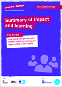 rganisations, including the Sunday Mirror, Channel 4 and Top Santé, to make a pledge to tackle mental health stigma and discrimination. We organised 12 meet the media events, mostly aimed at professionals working in specific sectors, including sports journalism, documentaries, and entertainment and reality TV. Our Get the Picture campaign, launched at an event for picture editors, encouraged media agencies to stop using stigmatising images to illustrate stories about mental health. What we achieved: Input into 75 soap opera and drama storylines; 12 events attended by 594 media professionals; 77% used their learning within two months of the event; 54,450 visits to our media online resource; nine media organisations signed a Time to Change pledge." (Page 2)