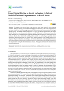 vices. The mobile platform is regarded as a novel and effective tool to reduce the digital divide. Based on a case of one mobile platform, namely WeCountry in Chinese rural areas, this study illustrates how a mobile platform bridges the digital divide and helps rural areas achieve social inclusion. Results show that: (1) the mobile platform mainly acts on the digital capability divide elimination, and it has to guide and increase users’ usage capability; (2) the mobile platform can empower villagers in structural, psychological, and resource dimensions, achieving political inclusion, social participation inclusion, and economic inclusion; (3) platform providers and government are key organizations during the divide elimination process. This paper concludes with theoretical and practical implications." (Abstract)