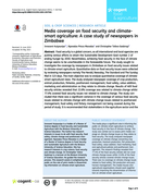 . The study sought to investigate the coverage by newspapers in Zimbabwe on food security issues related to climate-smart agriculture. Quantitative data on food security issues were collected by reviewing newspapers namely The Herald, Newsday, The Standard and The Sunday Mail in 123 days. The main objective was to analyse quantitative coverage of climate-smart agricultural news. The study analysed newspaper coverage of crop production, animal production, fisheries, postharvest management, food safety, value addition, marketing and administration as they relate to climate change. Results of 469 food security articles revealed that 22.6% coverage was related to climate change whilst 77.4% covered food security issues not related to climate change. The study concluded that there was a significant variance in the coverage of various food security issues related to climate change with climate change issues related to postharvest management, food safety and fishery management not being covered during the period of study. It is recommended that stakeholders in the agriculture sector and the media industry should work towards improving the publication of climate change adaptation and mitigation in agriculture." (Abstract)