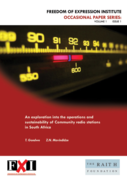 icipation at the local level. In a rapidly changing socio-economic and civil-political context, it is therefore vital that the long term sustainability of this medium be ensured. This study explored the operating environment and narrows the scope of issues impacting on social, institutional and financial sustainability of community radio. The influence of government regulation and community participation were identified as the primary concerns for sustainability. Government, through ICASA and the various broadcasting legal and policy instruments, has immediate responsibilities for community media and community radio in particular which include: the allocation and management of radio frequency spectrum; regulation of spectrum and content among others. How these responsibilities are fulfilled can greatly affect the long term sustainability of community radio in South Africa. These concerns require further examination in order to ensure that efforts of government are influenced for apt and suitable regulatory response. On the other end of the spectrum, the role of communities requires further exploration to ensure that it is exercised with positive effect." (Conclusion)