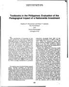 year of implementation, the Textbook Project produced ap-proximately 20 million first and second grade textbooks in science, mathematics, and Pilipino. These were distributed nationwide in the 1977-78 school year at a ratio of two pupils per book. In the course of its 5-year duration, the Textbook Project would produce 97 million books covering all subject areas from first grade through high school and would distribute enough so that there would be only two students per book at each grade level in each subject. Books cost an average of US$.55 each (for an average length of 180 pages); the overall program increased per student costs by about 1% (Orivel, 1979). Teacher training in the use of the books was part of the project. These and other aspects of implementation are described in detail by Aprieto (1983). Textbook content was geared closely to the national curriculum and tightly screened for clarity of presentation. Photo and colors were used judiciously.